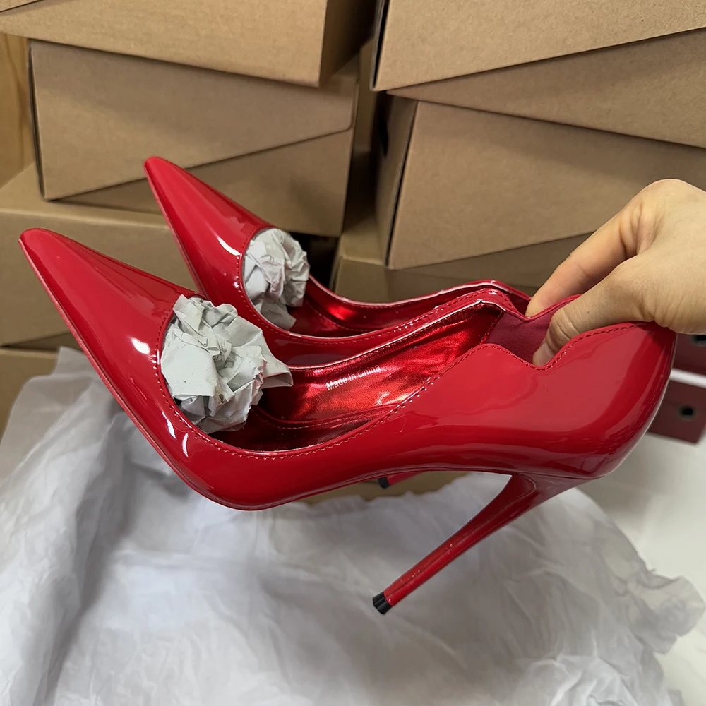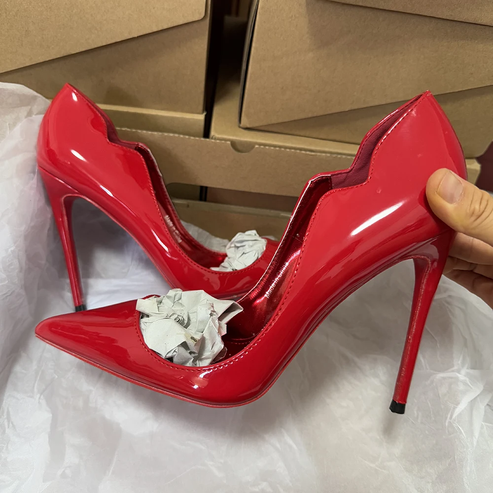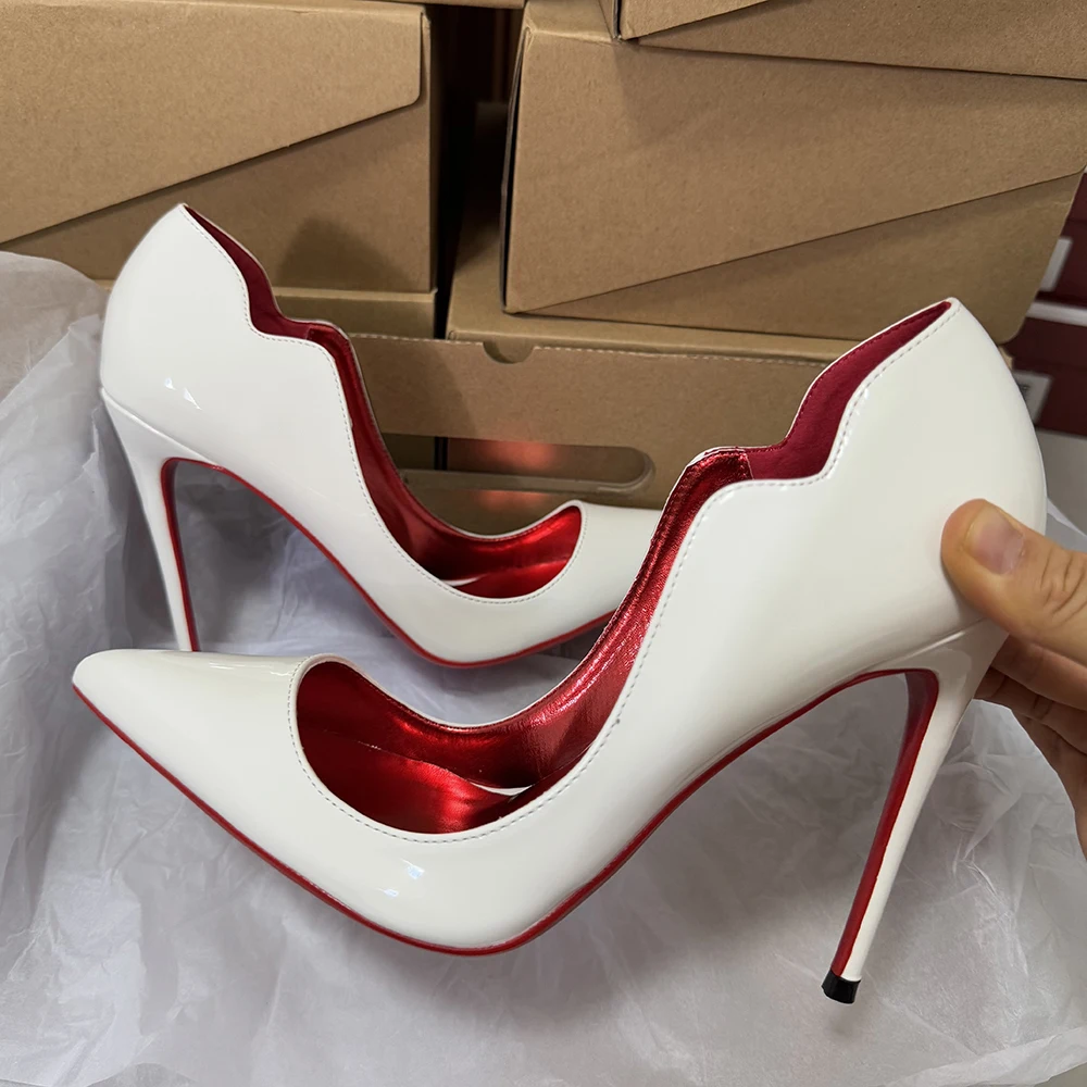 Veowalk Wave Cut Women Pointed Toe Stiletto Pumps Fashion Design Red Inside Slip On 12cm High Heel Shoes Glossy Nude Black White